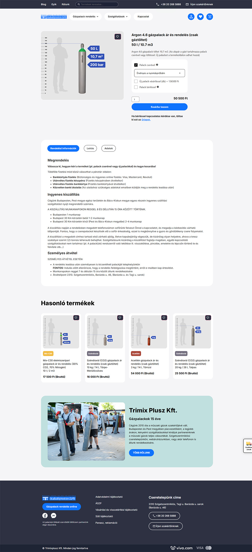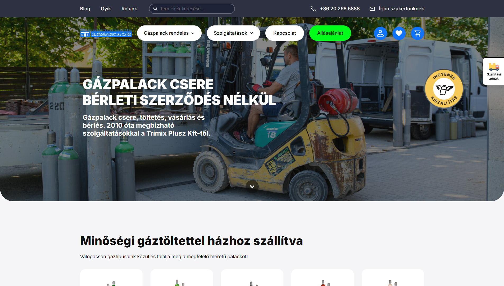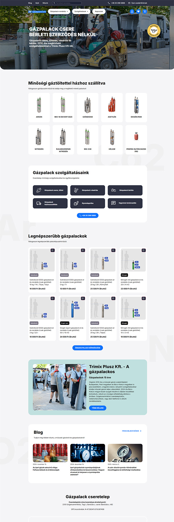 A Trimixplusz Kft. 2010 óta a hazai lakossági gázpalack kereskedelem meghatározó szereplője. Nem csak értékesítésben, de különböző szolgáltatásokban, bérlésben is kiemelkedő szerepet vállal a hazai piacon évtizedekre visszanyúlóan. Idén úgy érezték, hogy ideje új sebességre váltani és online megjelenésükben is tükrözni azt a minőséget, melyet munkájuk során is minden nap képviselnek. Az arculati és grafikai tervezés érdeme itt ugyan nem hozzánk kötődik, de a meglehetősen sok egyedi igény és kérés azért sikeresen megdolgoztatott minket is. A teljes webes felépítésen túl rengeteg egyedi megoldást kellett programoznunk, mely megfelelő kihívással és motivációval látott el minket is, a projekt számunkra is érdekes újdonságokat és újabb ismereteket mutatott meg, ezért bátran mondhatjuk, hogy élveztük a közös munkát.